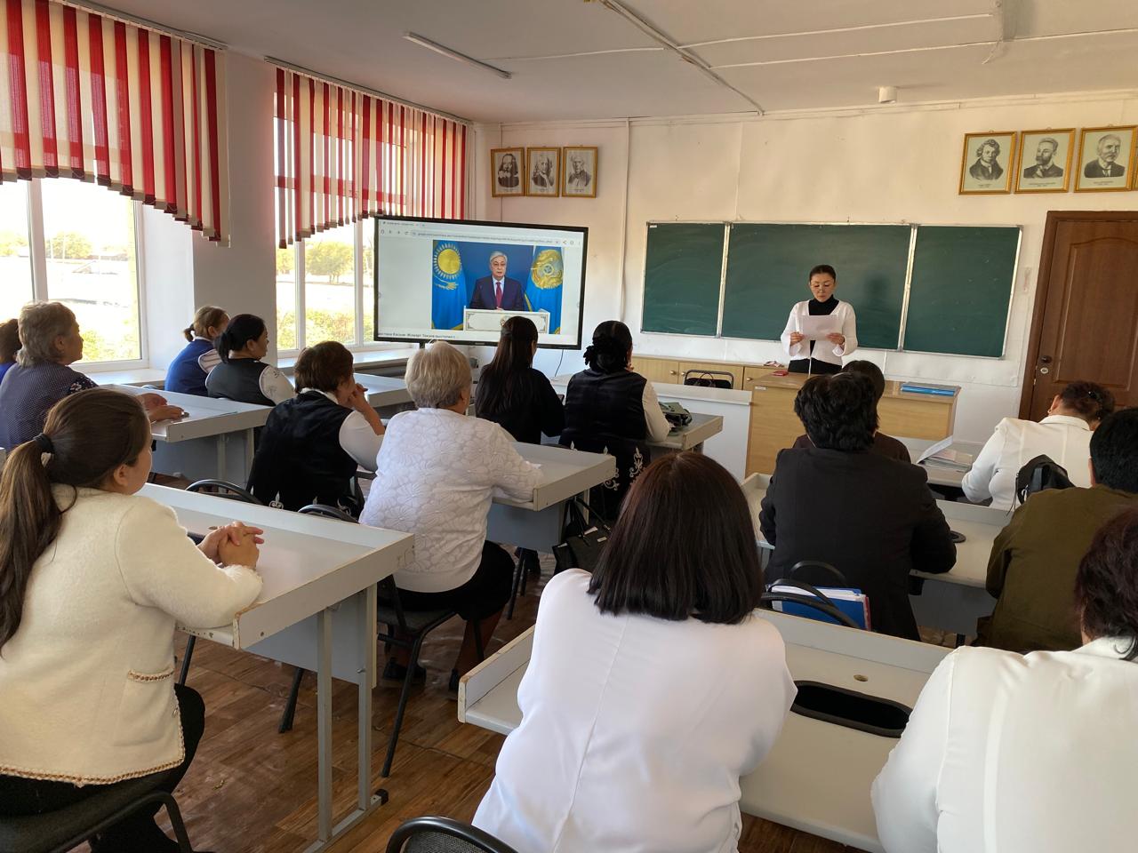 Іс-шараның мақсаты – ұжым мүшелерін Жолдаудағы маңызды міндеттермен таныстыру, білім беру саласындағы жаңалықтар мен басымдықтарды түсіндіру және оларды мектеп тәжірибесіне енгізу жолдарын талқылау.