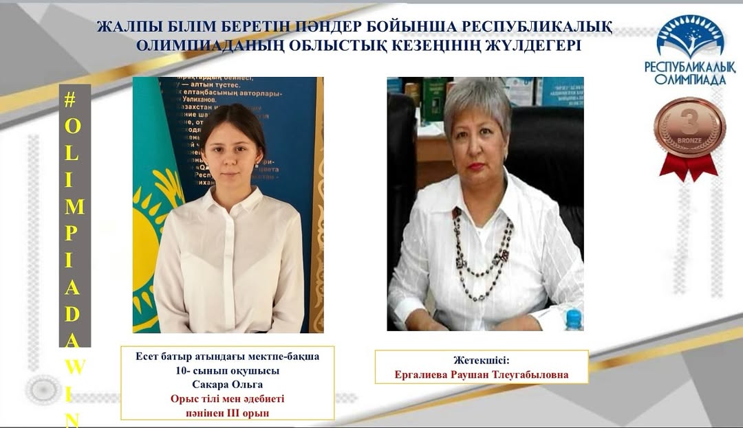 Жалпы білім беретін пәндер бойынша 9-11 класс оқушылары арасында өткен республикалық олимпиаданың облыстық кезеңіне орыс тілі мен әдебиеті пәнінен Сакара Ольга 10в сынып оқушысы қатысып, жүлделі 3-орынды иеленді. Жетекшісі: Ергалиева Раушан Тлеугабыловна