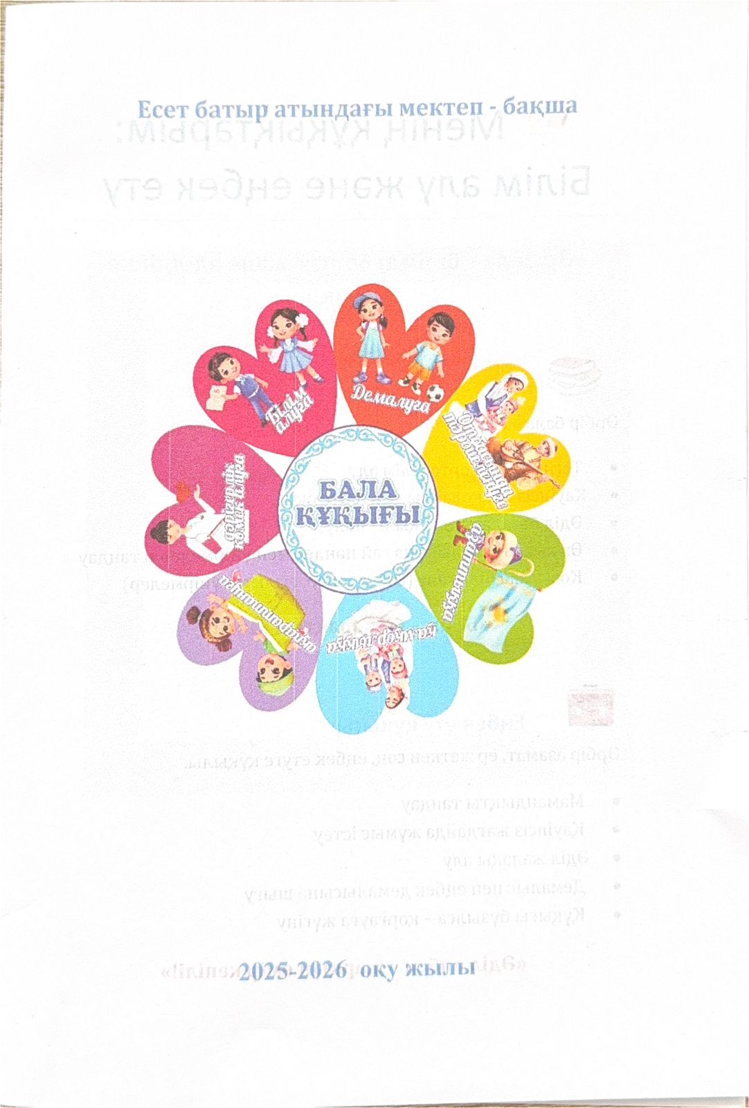 Есет батыр атындағы мектеп-бақшасында оқушыларының құқықтық сауаттылықтарын арттыру мақсатында мектепте білім алу және еңбек ету құқықтары жөнінде арнайы ақпараттық брошюралар дайындалып, таратылды.