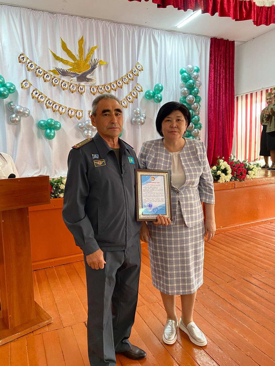 Ұлағатты ұстаздың зейнетке шығу күніне орай, мектеп ұжымы және Алға аудандық білім бөлімінің басшысы Мырзагалиева Гульназ Сартбаевна, Алға аудандық білім қызметкерлері кәсіподағы ұйымының төрағасы Еркусимова Рита Зейнуллиновна арнайы келіп, білікті ұстаздың білім саласын өркендету жолындағы қосқан үлестері мен шәкірт тәрбиелеудегі ерен еңбектері үшін алғыс айтып, құрмет көрсетті.